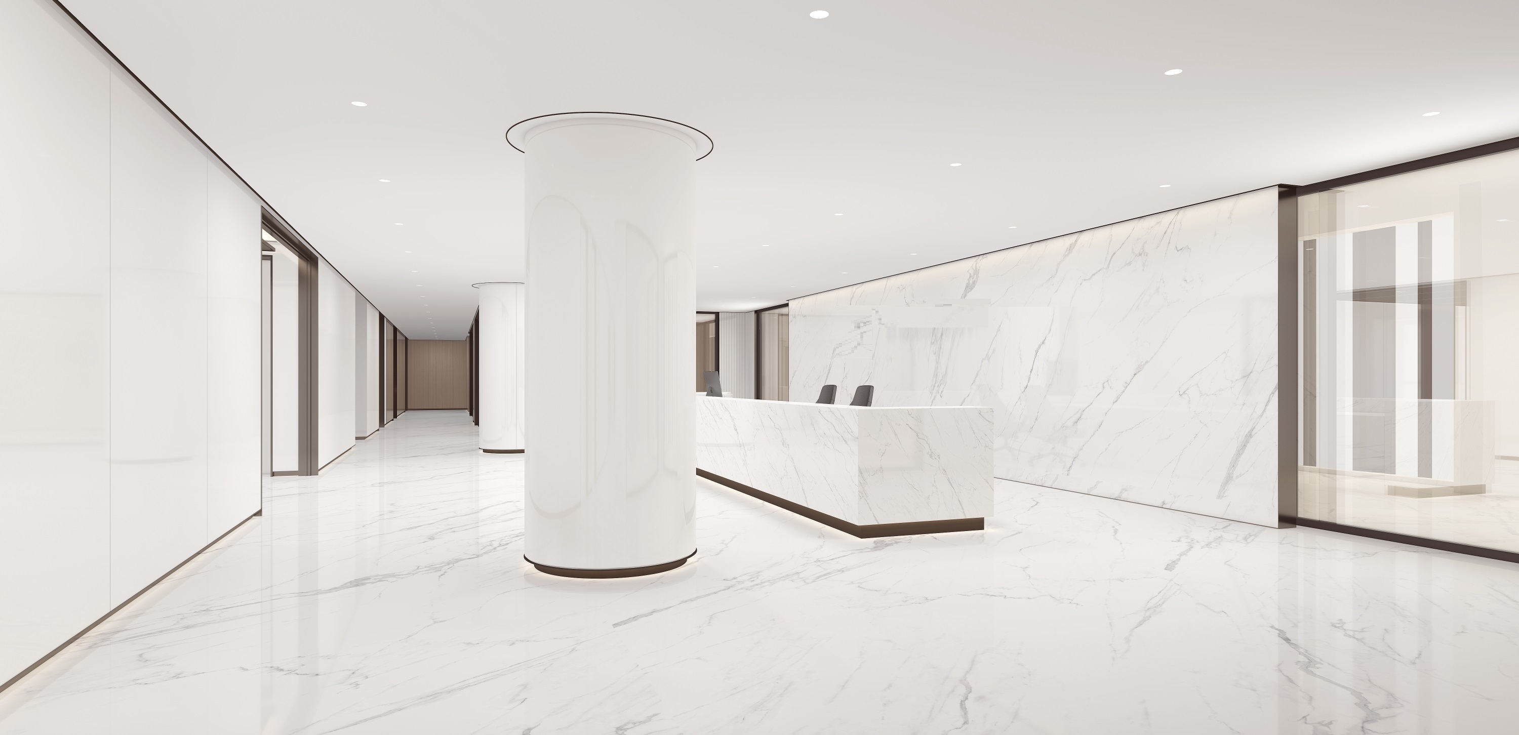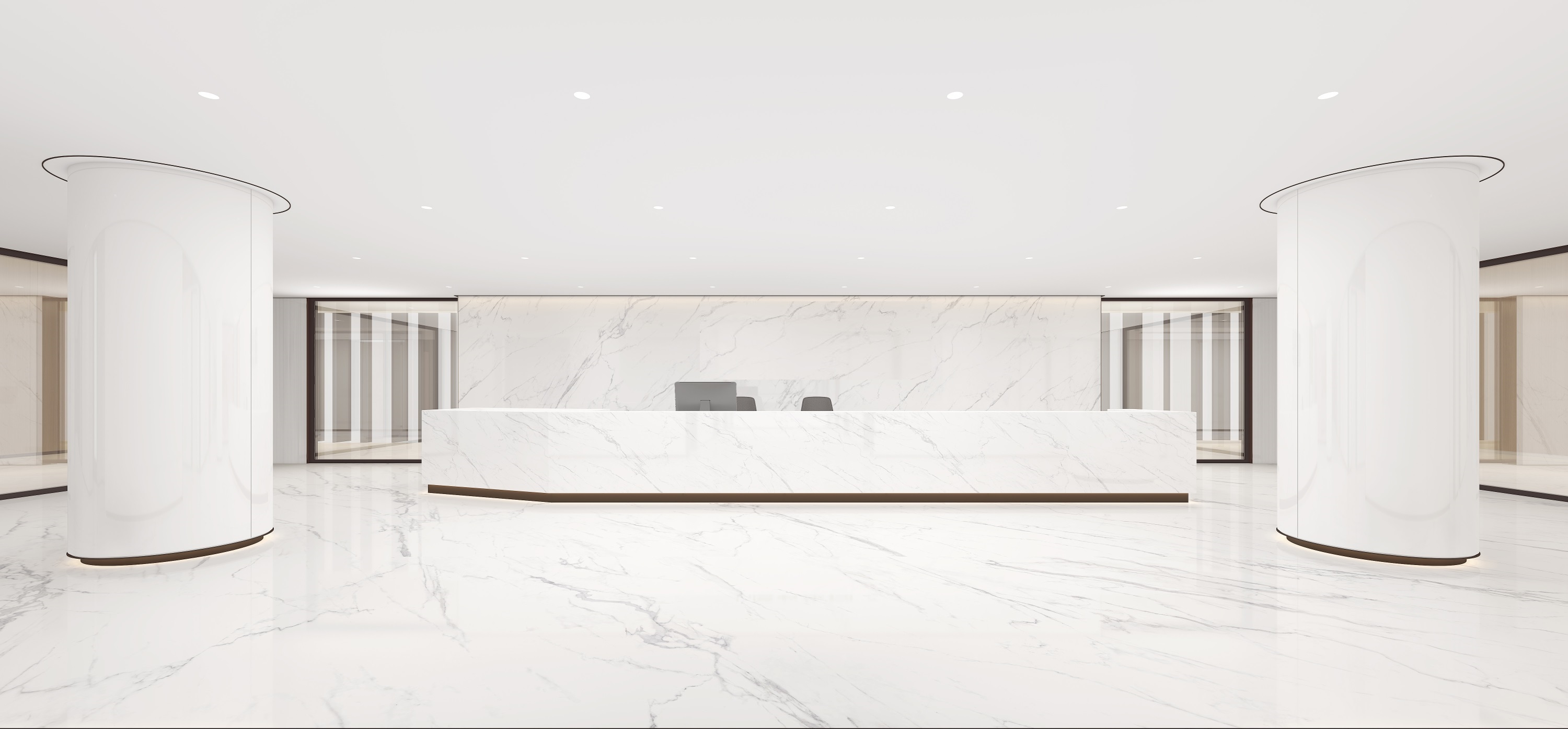 案例說明:本案設計中企業形象墻,以其企業文化的新興、蓬勃、嚴謹為主題,兩側以“居有竹、步步高”的銀色墻柱帶來視覺沖擊感,加上企業形象色的類比色、淺色石材及不銹鋼條的運用,顯示出金屬的質感和工業文明的主題;然而休息區的陳設卻明麗蔥郁,充滿人文情感的自然氣息,恰恰彌補了視覺中的剛硬個冷竣,使人倍感親切。
