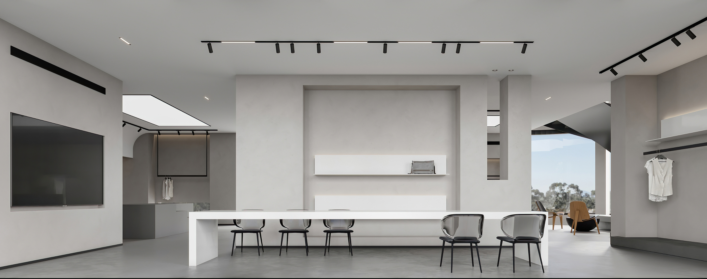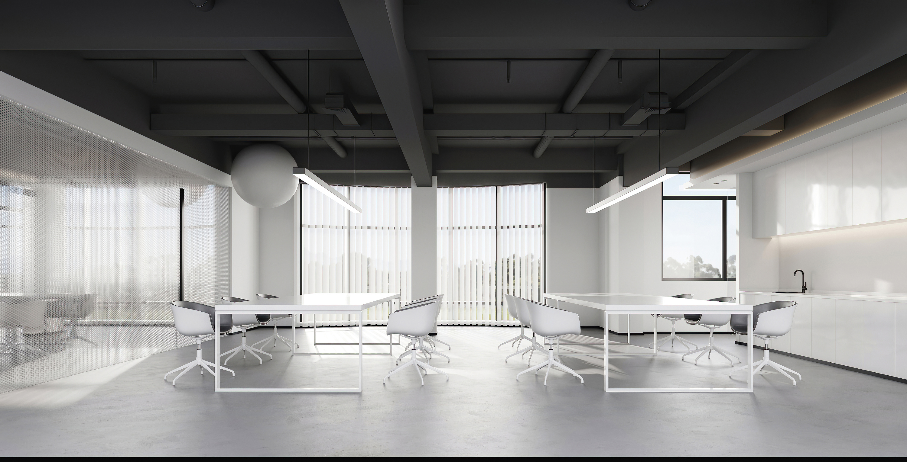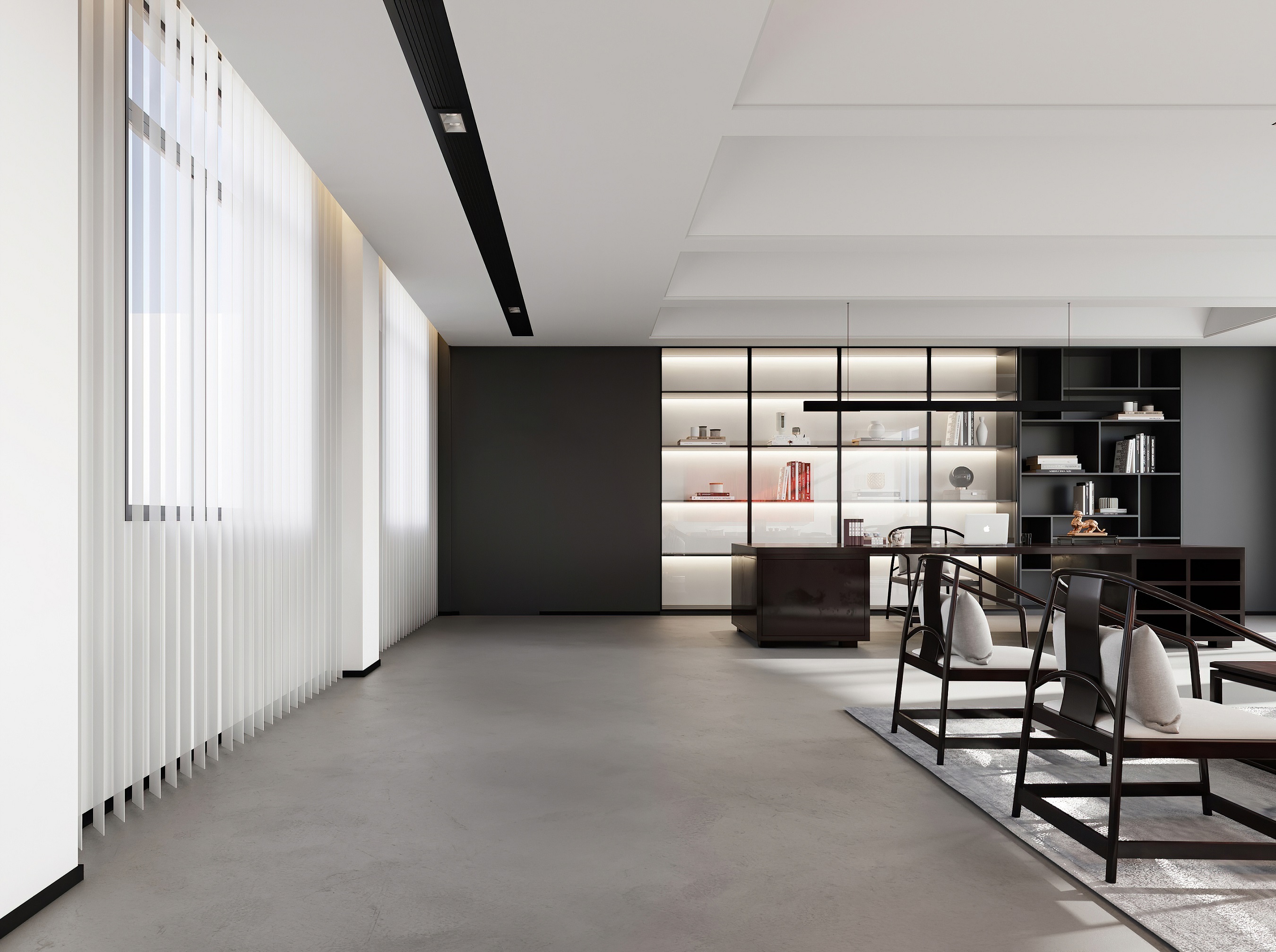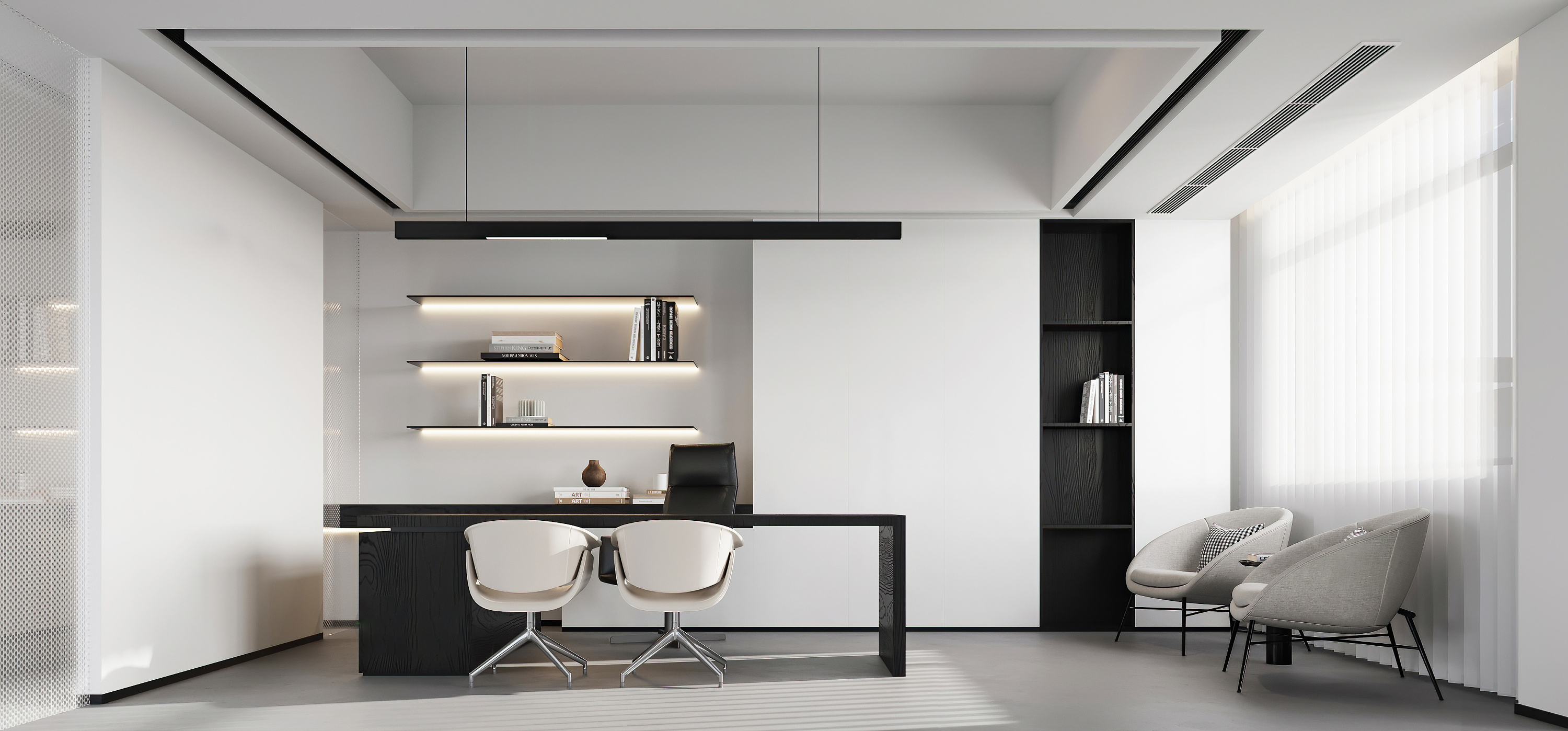 案例說明: 本案在這個(gè)辦公室設(shè)計(jì)中,甲方要求,有功能區(qū)設(shè)置,有總經(jīng)理,總經(jīng)理是本公司中最高的職務(wù),所以在我的設(shè)計(jì)中給他選擇了一個(gè)比較好的朝向,采光比較好、地面采用仿古顯紋復(fù)合強(qiáng)化淺色木地板。防滑耐磨。幾何式的辦公桌莊嚴(yán)不失人性化。自然的美巧妙的運(yùn)用到設(shè)計(jì)之中,突顯對(duì)美好生活的向往。放松工作時(shí)的狀態(tài),副總經(jīng)理兩間,裝修風(fēng)格跟總經(jīng)理相符,比較統(tǒng)一。會(huì)議室,在平面功能上。考慮了合理的行動(dòng)路線,東面墻對(duì)應(yīng)窗的位置設(shè)計(jì)了落地的玉砂玻璃隔墻,以滿足展示區(qū)的采光要求。