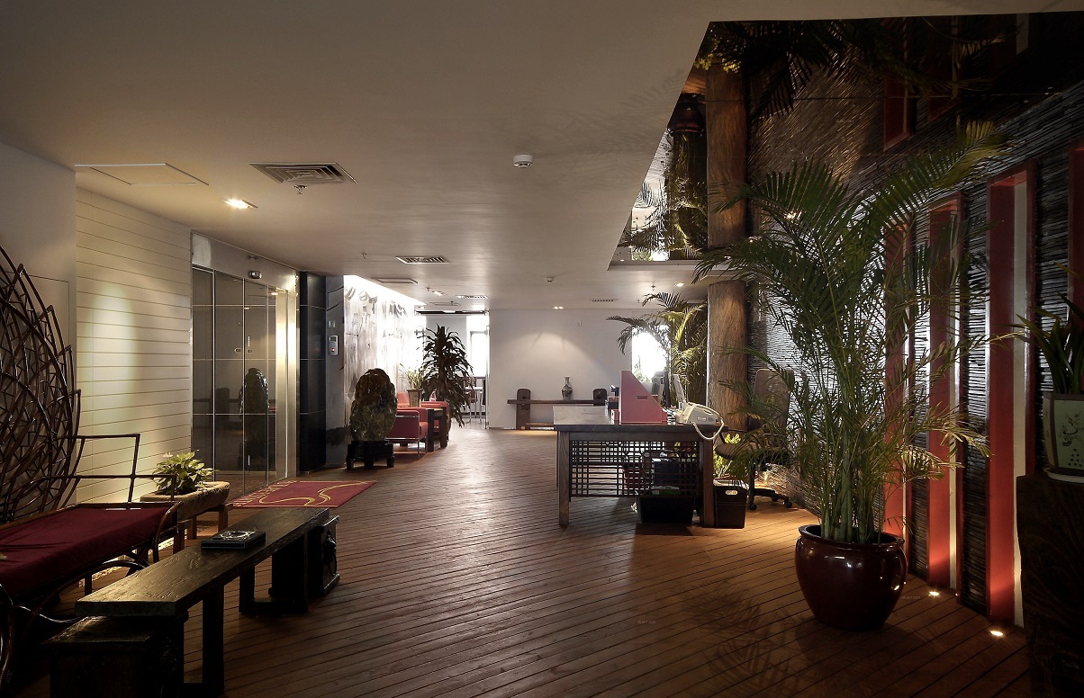 案例說明:本案設計中企業形象墻,以其企業文化的新興、蓬勃、嚴謹為主題,兩側以居有竹、步步高的銀色墻柱帶來視覺沖擊感,加上企業形象色的類比色、淺色石材及不銹鋼條的運用,顯示出金屬的質感和工業文明的主題;然而休息區的陳設卻明麗蔥郁,充滿人文情感的自然氣息,恰恰彌補了視覺中的剛硬個冷竣,使人倍感親切。
